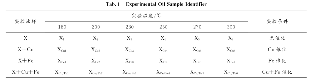 量取 150mL?。?放入高溫高壓反應(yīng)釜中,快速升溫至實(shí)驗(yàn)溫度( 180 , 200 , 230 , 250 , 270 , 300℃ ),在此基礎(chǔ)上,添加確定的金屬片,在不同溫度下反應(yīng) 2h ,反應(yīng)結(jié)束后置于冰水浴中冷卻至室溫,取出反應(yīng)釜中的實(shí)驗(yàn)油樣待用 .金屬片為鐵片和銅片,尺寸為17mm×12mm×1mm.在金屬片添加前,經(jīng)過碳化硅砂紙的打磨,然后浸潤于異辛烷溶劑中,貯存?zhèn)溆茫褂脮r(shí),用脫脂棉擦去表面上的溶劑,將其置于潤滑油中,避免金屬表層立即氧化而影響高溫模擬氧化實(shí)驗(yàn).反應(yīng)油樣的編號列于表1.